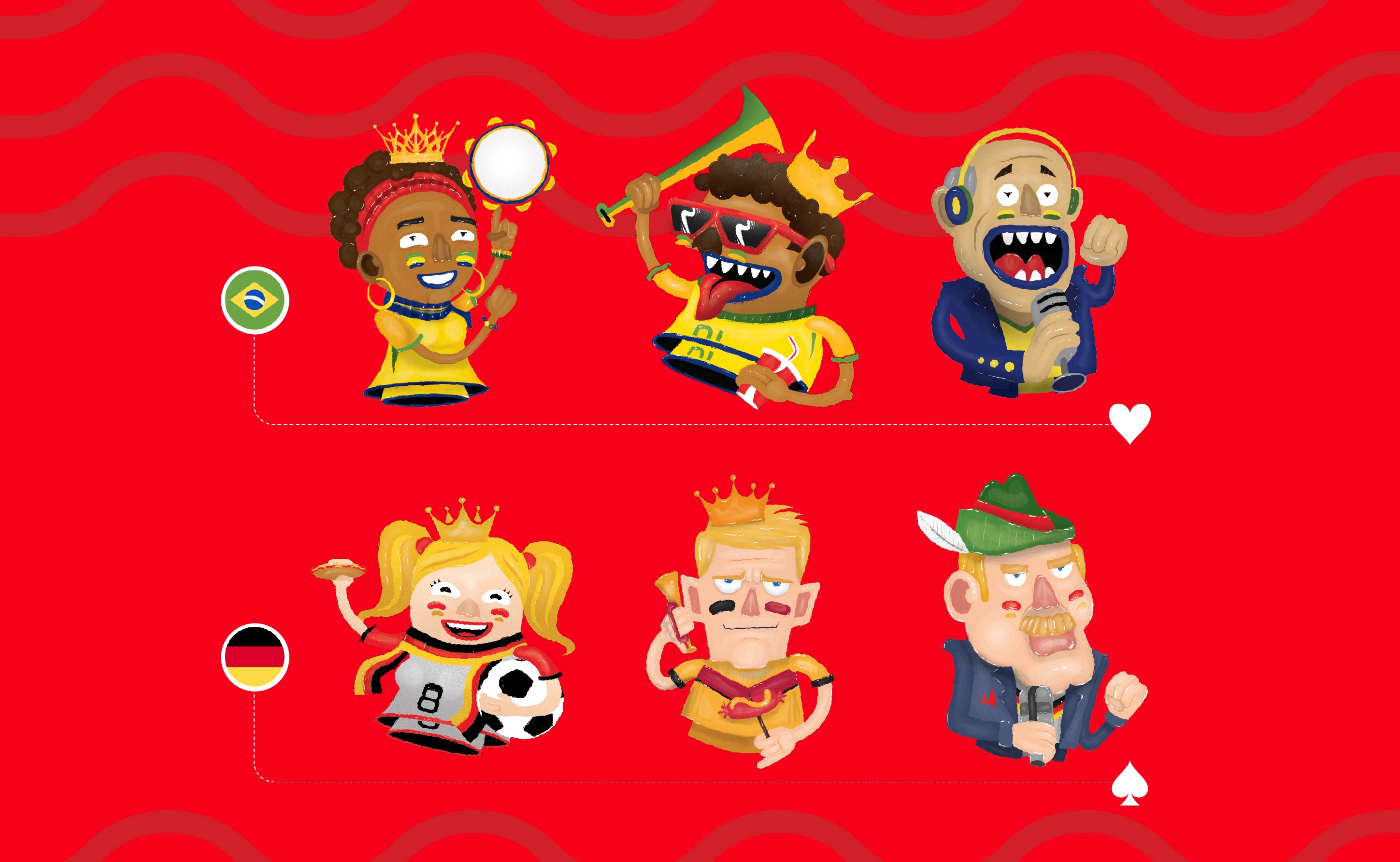 Characters inspired by "Matryoshkas", a traditional Russian handmade toy. Those selected to represent the suits were the biggest World Cup winners: Brazil (5 titles), Germany and Italy (4 titles) and Argentina (3 titles).